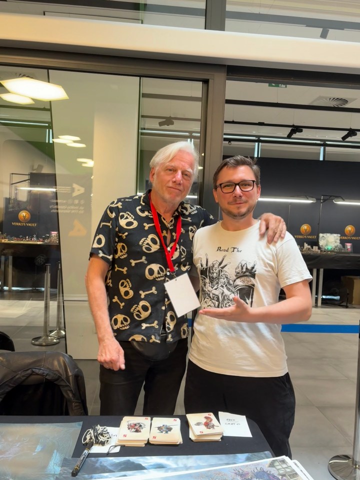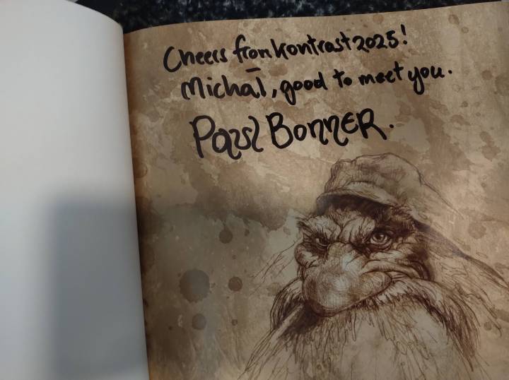 But digressions and reminiscences aside, let’s return to the hero of today’s article. After years of interacting with the world of Mutant Chronicles, Paul Bonner and his illustrations have risen to almost cult status. So it’s no surprise that news of his presence at this year’s Kontrast spread quickly, and old Warzoners and Doomtrooperers dug up their artifacts from the deepest recesses of their attics and basements to have them signed by the master. Even players who had not had any contact with this series of games for decades became active. The result was that poor Paul spent a full 8 hours signing autographs, with a short break for a meal, and then went to his discussion panel, which lasted another 1.5 hours. And as far as I know, he was still bravely signing autographs on Sunday. I managed to get his autographs on his artbook, the Mutant Chronicles 1st edition rulebook, and most importantly, the Warzone 1st edition rulebook – my first book from this series of games.